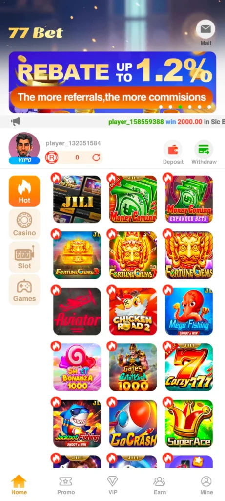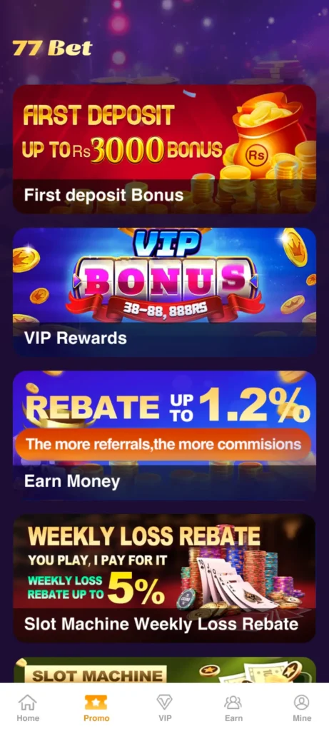 From welcome bonuses for new users to cashback and VIP rewards for loyal players, 77bet keeps things exciting. Free spins, festive promos, and referral rewards add even more value.