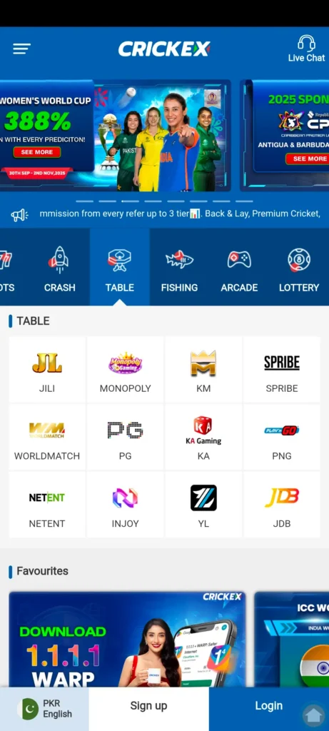 Want the real casino atmosphere without leaving home? Crickex’s Live Dealer section connects you with professional hosts who run real games through HD streaming. You can join tables for Live Roulette, Live Blackjack, Live Baccarat, and Andar Bahar. The interaction with live dealers and other players makes the experience truly immersive.