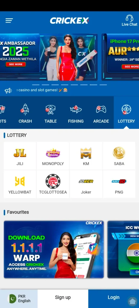If you prefer luck-based games, Crickex’s Lottery, Bingo, and Keno sections are made for you. You simply pick numbers and wait for the draw it’s easy, light-hearted fun with real cash prizes.