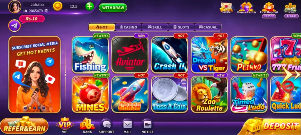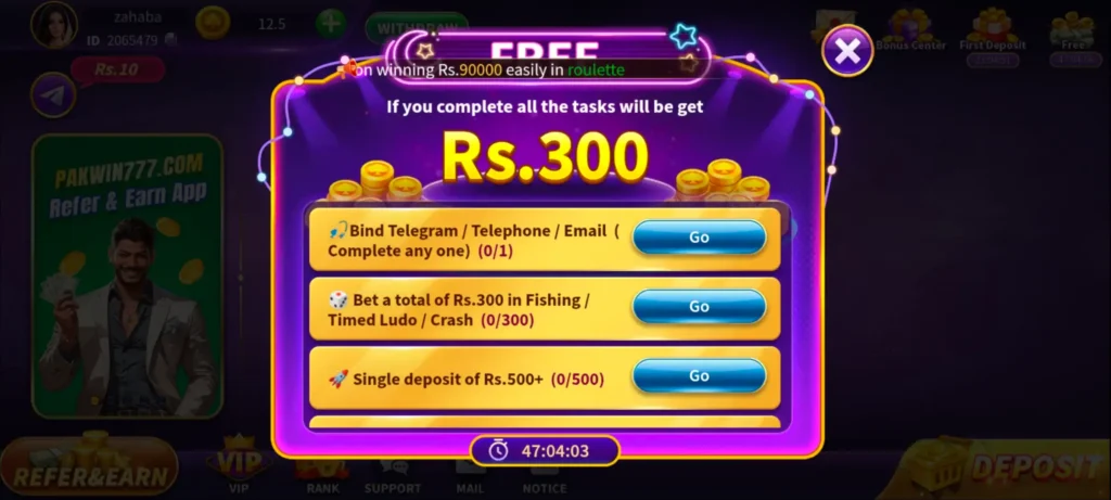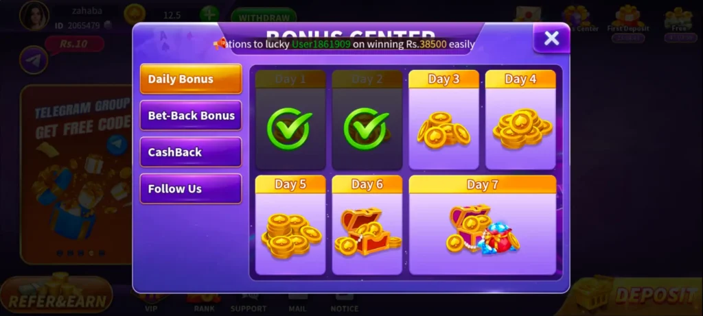 - Play and Win Games: The main way to earn is by wining different games such as slots, teen Patti, poker , roulette, and lucky spins . Each win gives or real rewards.
